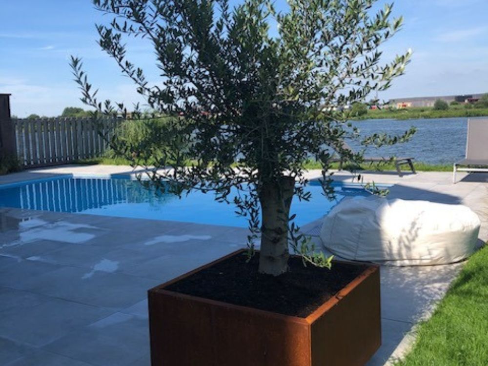 Egy különleges elem egy olívafa nagy cserépben. Főleg medencével kombinálva azonnal mediterrán hangulatot visz a kertedbe. Ha kerekeket teszel a cserép aljára, könnyen mozgathatod. Szeretnéd tudni, hogyan gondozd a legjobban az olívafát? Olvasd el a blogunkat: ‘Olívalevél nagy növényládában’.