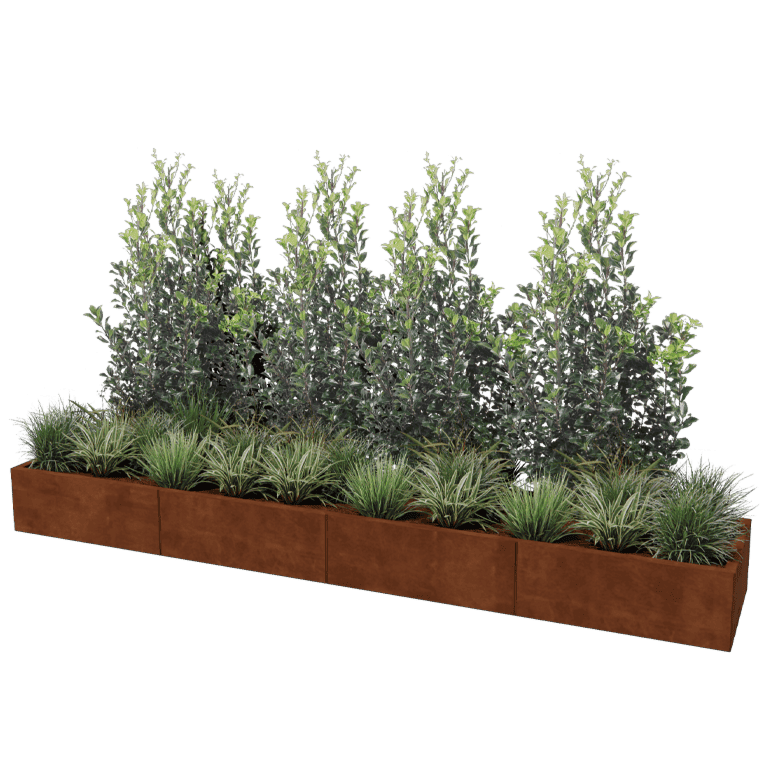 A moduláris virágtartóink panelei kiváló minőségű Corten-A acéllemezből készülnek. Ennek a fémfajtának egyedi tulajdonsága, hogy nagyon sűrű oxidbőrt (rozsda réteg) képez. Ezért a átrozsdásodás lehetetlen. A sűrű oxidbőr megvédi a mélyebben fekvő anyagot az oxigéntől, így az oxidáció erősen lelassul, míg a korrózió folytatódik. A corten acél virágtartó rozsdamentes, szürke fém színben kerül szállításra. A rozsdásodási folyamat hetek vagy 2 hónap után kezdődik, ehhez nincs szükség kezelésre. A rozsdásodási folyamat során a virágtartó színt adhat le. Corten acél egy fémötvözet, amely vasból áll, amelyhez rezet, foszfort, szilíciumot, nikkelt és krómot adtak hozzá.