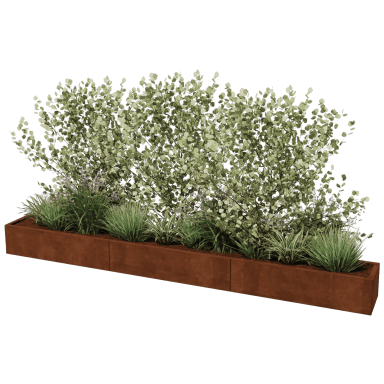 A moduláris virágtartóink panelei kiváló minőségű Corten-A acéllemezből készülnek. Ennek a fémfajtának egyedi tulajdonsága, hogy nagyon sűrű oxidbőrt (rozsda réteg) képez. A átrozsdásodás lehetetlen. A sűrű oxidbőr megvédi a mélyebben fekvő anyagot az oxigéntől, így az oxidáció erősen lelassul, míg a korrózió folytatódik. A corten acél virágtartó rozsdamentes, szürke fém színben kerül szállításra. A rozsdásodási folyamat hetek vagy 2 hónap után kezdődik, ehhez nincs szükség kezelésre. A rozsdásodási folyamat során a virágtartó színt adhat le. Corten acél egy olyan fémötvözet, amely vasból áll, amelyhez rezet, foszfort, szilíciumot, nikkelt és krómot adtak hozzá.